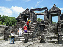 Candi refers to a structure based on the Indian type of single-celled shrine, with a pyramidal tower above it, and a portico.[7] The term Candi is given as a prefix to the many temple-mountains in Indonesia, built as a representation of the Cosmic Mount Meru, an epitome of the universe. However, the term also applied to many non-religious structures dated from the same period, such as gapura (gates), petirtaan (pools) and some of habitation complexes. Examples of non-temple candis are the Bajang Ratu and Wringin Lawang gates of Majapahit. The "Candi Tikus bathing pool" in Trowulan and Jalatunda in Mount Penanggungan slopes, as well as the remnants of non-religious habitation and urban structures such as Ratu Boko and some of Trowulan city ruins, are also considered candi.