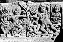 The walls of candi often displayed bas-reliefs, either serves as decorative elements as well as to convey religious symbolic meanings; through describing narrative bas-reliefs. The most exquisite of the temple bas-reliefs can be found in Borobudur and Prambanan temples. The first four terrace of Borobudur walls are showcases for bas-relief sculptures. These are exquisite, considered to be the most elegant and graceful in the ancient Buddhist world.[18] The Buddhist scriptures describes as bas-reliefs in Borobudur such as Karmavibhangga (the law of karma), Lalitavistara (the birth of Buddha), Jataka, Avadana and Gandavyuha. While in Prambanan the Hindu scriptures is describes in its bas-relief panels; the Ramayana and Bhagavata Purana (popularly known as Krishnayana).