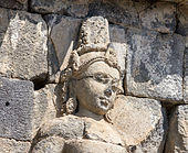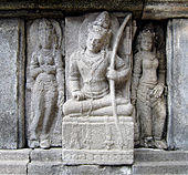 In Buddhist temples, the panels of bas-reliefs usually adorned with exquisite images of male figure of Bodhisattvas and female figure of Taras, along with Gandarvas heavenly musicians, and sometimes the flock of Gana dwarfs. These are the deities and divinities in Buddhist beliefs, which resides in the Tushita heaven in Buddhism cosmology. The notable images of boddhisattvas could be found adorning outer walls of Plaosan, Sari, Kalasan, Pawon and of course Borobudur temple.