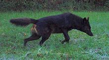 The coyote is typically smaller than the gray wolf, but has longer ears and a relatively larger braincase,[5] as well as a thinner frame, face, and muzzle. The scent glands are smaller than the gray wolf's, but are the same color.[7] Its fur color variation is much less varied than that of a wolf.[11] The coyote also carries its tail downwards when running or walking, rather than horizontally as the wolf does.[12]