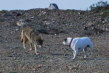 In 1993, a study proposed that the wolves of North America display skull traits more similar to the coyote than wolves from Eurasia.[53] In 2010, a study found that the coyote was a basal member of the clade that included the Tibetan wolf, the domestic dog, the Mongolian wolf and the Eurasian wolf, with the Tibetan wolf diverging early from wolves and domestic dogs.[54] In 2016, a whole-genome DNA study proposed, based on the assumptions made, that all of the North American wolves and coyotes diverged from a common ancestor less than 6,000–117,000 years ago. The study also indicated that all North American wolves have a significant amount of coyote ancestry and all coyotes some degree of wolf ancestry, and that the red wolf and eastern wolf are highly admixed with different proportions of gray wolf and coyote ancestry.[55][56] The proposed timing of the wolf/coyote divergence conflicts with the finding of a coyote-like specimen in strata dated to 1 Mya.[[[Wikipedia:Citing_sources|