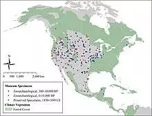 The oldest fossils that fall within the range of the modern coyote date to 0.74–0.85 Ma (million years) in Hamilton Cave, West Virginia; 0.73 Ma in Irvington, California; 0.35–0.48 Ma in Porcupine Cave, Colorado, and in Cumberland Cave, Pennsylvania.[50] Modern coyotes arose 1,000 years after the Quaternary extinction event.[51] Compared to their modern Holocene counterparts, Pleistocene coyotes (C. l. orcutti) were larger and more robust, likely in response to larger competitors and prey.[51] Pleistocene coyotes were likely more specialized carnivores than their descendants, as their teeth were more adapted to shearing meat, showing fewer grinding surfaces suited for processing vegetation.[52] Their reduction in size occurred within 1,000 years of the Quaternary extinction event, when their large prey died out.[51] Furthermore, Pleistocene coyotes were unable to exploit the big-game hunting niche left vacant after the extinction of the dire wolf (C. dirus), as it was rapidly filled by gray wolves, which likely actively killed off the large coyotes, with natural selection favoring the modern gracile morph.[52]