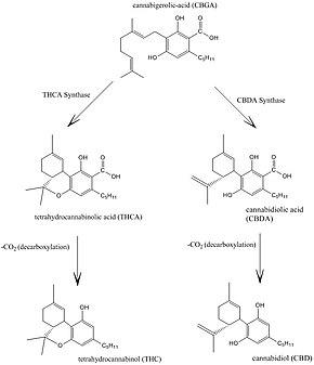 - ^ Taura F, Sirikantaramas S, Shoyama Y, Yoshikai K, Shoyama Y, Morimoto S (June 2007). "Cannabidiolic-acid synthase, the chemotype-determining enzyme in the fiber-type Cannabis sativa". FEBS Letters. 581 (16): 2929–34. doi:10.1016/j.febslet.2007.05.043. PMID 17544411. S2CID 20253070.