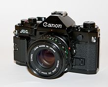 The Canon A-1 is an advanced level single-lens reflex (SLR) 35 mm film camera for use with interchangeable lenses. It was manufactured by Canon Camera K. K. (today Canon Incorporated) in Japan from April 1978 to 1985. It employs a horizontal cloth-curtain focal-plane shutter with a speed range of 30 to 1/1000 second plus bulb and flash synchronization speed of 1/60 second. It has dimensions of 92 millimetres (3.6 in) height, 141 millimetres (5.6 in) width, 48 millimetres (1.9 in) depth and 620 grams (22 oz) weight. Unlike most SLRs of the time, it was available in only one color; all black. The introductory US list price for the body plus Canon FD 50 mm f/1.4 SSC lens was $625, the camera was generally sold with a 30–40% discount (roughly $375 to $435).