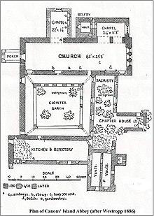 Canon Island (or Innisgad) was originally called Elanagranoch.[4] The abbey was founded in the late twelfth century. The 270 acre island was granted to the Augustinian Canons from Clare Abbey in 1189 by Domnall Mór Ua Briain (Donald O'Brien), king of Thomond.[5][6]