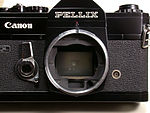It is true the finder does not go black during exposure, but at small lens apertures, the eye has no time to adjust to the dark finder. The operating noise from the Pellix is surprisingly similar to that of the Canon FX using a moving reflex mirror. Canon made two fast lenses, the FL 50mm 1:1.4 and the FL 58mm 1:1.2, in order to compensate for the light loss, but fast lenses might increase the risk of the sun burning holes in the shutter curtain not being protected by a solid mirror; a fact anticipated and solved by providing the Pellix with a metal shutter curtain. Another obstacle is the risk of light finding its way into the camera by way of the finder window during exposure, since there is no mirror to block the path in its up-position. This was also anticipated, and a finder blind is provided which is operated by turning the ring under the rewind knob, especially useful when leaving the camera on a stand. The Meter circuit is susceptible to breakage due to the CdS meter arm being moved into position behind the pellicle mirror during exposure reading.[4] A special lens was made available for the Canon Pellix, the FLP 38mm 1:2.8, utilising the fact the camera has a stationary mirror that will not hit the lens' rear element. The FLP code indicates that this lens is exclusively to be used on Pellix camera.[3]