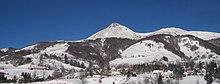 Cantal lies in the middle of France's central plateau.[2] The Cantal range is a group of extinct and eroded volcanic peaks. Its highest point is the Plomb du Cantal, which reaches an elevation of 1,858 meters (6,096 ft).[3] Its neighbors are Puy Mary (elev. 1,787 meters or 5,863 feet) and Puy Chavaroche (elev. 5,722 feet or 1,744 meters). To their north lie the Cézallier and Dore ranges and the arid Artense Plateau. Immediately to their east is the fertile Planèze Plateau, bound on its east by the Monts de la Margeride.[2]