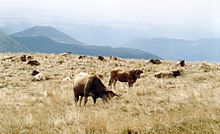 The climate being generally too cool and damp for grain, much of Cantal is given over to pasture for Aubrac and Salers cattle, sheep, and, formerly, horses. This in turn supports a dairy industry responsible for butter and Roquefort cheese[1] and the appellation-controlled cheeses Cantal, Salers, and Bleu d'Auvergne. Cantal is the French department with the greatest number of appellation-controlled cheeses,[4] although proper Roquefort is now restricted to cheese produced in the Aveyron department. The region's mineral products include coal, copper, lead, iron, antimony, granite, slate[1] and lime,[2] but the department's isolation and poor infrastructure long precluded their exploitation.[1] Before the First World War, the primary exports were livestock, cheese, butter, and coal and the main imports were coal, wine, grain, flour, and pottery. By then, it had been connected to both the Orleans and Midi railways.[2]