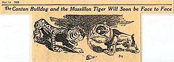 Sometime during the 1906 season, the Canton team became known as the "Bulldogs" although no one is quite sure how it came to be affixed to the Canton team. It wasn't called that in 1905, nor through most of the 1906 season. As late as November 4, R.C. Johnson, an editorial cartoonist with the Canton Repository, was only able to picture the Canton team as only a man with a club lying in wait for the Massillon Tiger. Most references to the team called it "Canton A.C.," "C.A.C.," "Canton eleven." "the Red and White" or "Wallace's Men." Suddenly, almost overnight, the team became the "Bulldogs", with a November 14, 1906 cartoon showing the Canton Bulldog facing off against the Massillon Tiger.