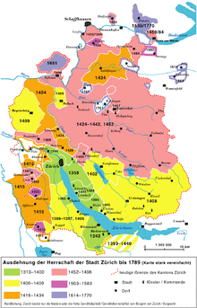 The territory of the canton of Zürich corresponds to the lands acquired by the city of Zürich after it became reichsfrei in 1218. Zürich pursued a policy of aggressive territorial expansion especially during the century following the revolution of the guilds in 1336. Zürich joined the Swiss Confederacy in 1351.