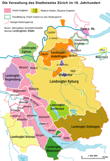 In the 18th century, the "inner bailiwicks" (Innere Vogteien) were under direct administration of city officials, while the "outer bailiwicks" (Äussere Vogteien) were ruled by the reeves of Kyburg, Grüningen, Greifensee, Eglisau, Regensberg, Andelfingen, Wädenswil, and Knonau. The city of Winterthur was nominally subject to Zürich but retained far-reaching autonomy.