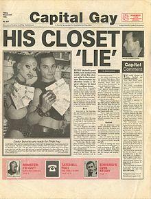 Capital Gay sponsored the London Lesbian and Gay Switchboard and involved itself in events in the wider gay community in London; its editorial line tended to be strong. It is credited by the Oxford English Dictionary with being the first publication in the world to use the term HIV, (the second being the international science journal Nature),[1] with the first regular column on AIDS in the world being written in Capital Gay by Julian Meldrum in 1982. For some years, with no reliable information on the threat of Aids publicly available in the medical or national press, Capital Gay widened its distribution to cover cities with large gay populations including Manchester and Brighton. Copies were sent by rail and distributed to local clubs, bars and hotels by volunteers.