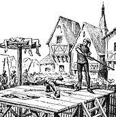 Execution of criminals and dissidents has been used by nearly all societies since the beginning of civilizations on Earth.[11] Until the nineteenth century, without developed prison systems, there was frequently no workable alternative to ensure deterrence and incapacitation of criminals.[12] In pre-modern times the executions themselves often involved torture with cruel and painful methods, such as the breaking wheel, keelhauling, sawing, hanging, drawing, and quartering, burning at the stake, flaying, slow slicing, boiling alive, impalement, mazzatello, blowing from a gun, schwedentrunk, and scaphism. Other methods which appear only in legend include the blood eagle and brazen bull.