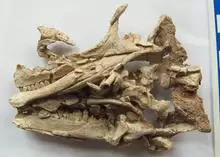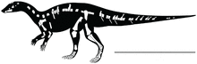 "Gadolosaurus" is an informal name given to an undescribed hadrosauroid from the Bayan Shireh Formation of Baishan Tsav, Mongolia.[72] The name "Gadolosaurus" was first used in a 1979 book by Japanese paleontologist Tsunemasa Saito, in a caption for a photo of a juvenile dinosaur skeleton.[73] This small individual was only about a meter long (39 inches). The skeleton was part of a Soviet exhibition of fossils in Japan. Apparently, the name comes from a Japanese phonetic translation of the Cyrillic word gadrosavr, or hadrosaur, and was never meant by the Russians to establish a new generic name.[74]