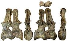 "Biconcavoposeidon" is the placeholder name for AMNH FARB 291, five consecutive posterior dorsal vertebrae of a brachiosaurid sauropod, from the Late Jurassic Morrison Formation, Wyoming.[33] Not much else is currently known about "Biconcaveoposeidon", except that it was discovered in the Bone Cabin quarry in 1898.[34]