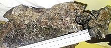 "Bananabendersaurus"[24] is the informal name given to an unnamed species of sauropod found in the Winton Formation, Australia.[25] The two known specimens of "Bananabendersaurus", known as Cooper and George, were discovered in 2005 and 2006 and have been dated to the early Cenomanian (ca. 98–95 Ma).[26] The Cooper specimen is known from both humeri and the left radius, while the George specimen is known from a single rib and a left femur.[26] "Bananabendersaurus" represents the largest dinosaur discovered in Australia to date – "Bananabendersaurus" was around 26 metres (85 ft) long on average.