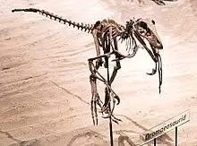 "Futabasaurus" is an informal name for a genus of theropod dinosaur from the Late Cretaceous of Japan, known only from a partial shin bone discovered in the Coniacian-age Ashizawa Formation of the Futaba Group.[68] It was coined by David Lambert in 1990 as a conversion from the Japanese nickname "Futaba-ryu", for an undescribed theropod.[69] Dong Zhiming and coauthors briefly discussed the fossil shin bone it was based on that same year, publishing a photograph. They considered the bone to belong to an indeterminate tyrannosaurid.[70] If the specimen is eventually described and named, it will require a different name, because the name Futabasaurus has since been used for a genus of plesiosaur.[71]