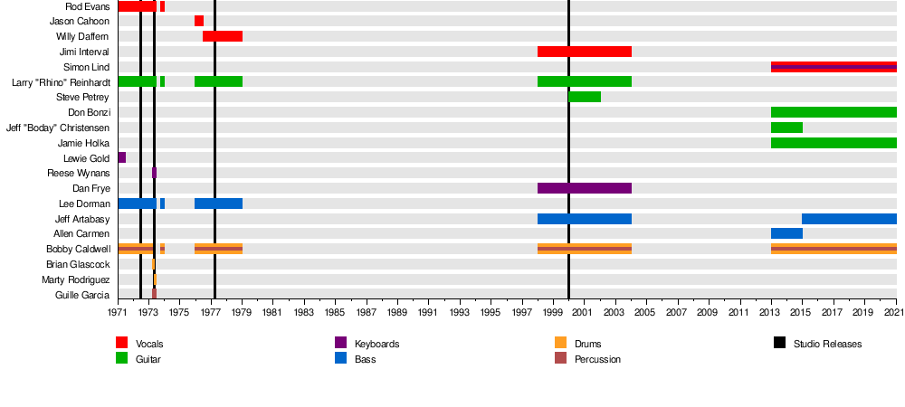 Past members | Lee Dorman Rod Evans Lewie Gold Larry "Rhino" Reinhardt Guille Garcia Brian Glascock Reese Wynans Marty Rodriguez Jason Cahoon Willy Daffern Dan Frye Jimi Interval Steve Petrey Allen Carmen Jeff "Boday" Christensen |