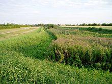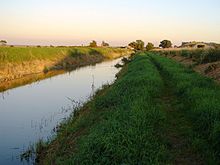 In other parts, however, the topography suggests that its use as a canal was unlikely or at least difficult: the segment which ran, and to some extent still runs, through the Soke of Peterborough rises from the River Nene to a ridge at Eye then falls to the River Welland. This it does in steady gradients, quite unlike the characteristics of a canal designed for transport. Its course makes it clear that this outcome was carefully planned.[8] At some level sections in Lincolnshire it has causeways of never-disturbed ground crossing it and it passes in gradients, up and down the sides of slight ridges.[7] Given the length of the canal, however, modern surveyors suggest that the original engineers may not have been able to keep the canal at a constant level (due to surveying difficulties or lack of budget to excavate deeper). Natural barriers may therefore have been left in place to partition the canal into sections, maintaining the required depth of water, with goods transhipped or boats dragged across the barriers. They may also have been a deliberate precaution against the whole section drying out in summer.[7][9]