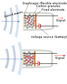The carbon microphone, also known as carbon button microphone, button microphone, or carbon transmitter, is a type of microphone, a transducer that converts sound to an electrical audio signal. It consists of two metal plates separated by granules of carbon. One plate is very thin and faces toward the speaking person, acting as a diaphragm. Sound waves striking the diaphragm cause it to vibrate, exerting a varying pressure on the granules, which in turn changes the electrical resistance between the plates. Higher pressure lowers the resistance as the granules are pushed closer together. A steady direct current is passed between the plates through the granules. The varying resistance results in a modulation of the current, creating a varying electric current that reproduces the varying pressure of the sound wave. In telephony, this undulating current is directly passed through the telephone wires to the central office. In public address systems it is amplified by an audio amplifier. The frequency response of most carbon microphones, however, are limited to a narrow range, and the device produces significant electrical noise.