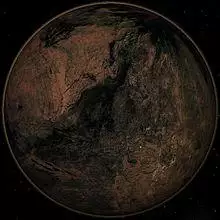 Marc Kuchner and Sara Seager coined the term "carbon planet" in 2005 and investigated such planets following the suggestion of Katharina Lodders that Jupiter formed from a carbon-rich core.[2] Prior investigations of planets with high carbon-to-oxygen ratios include Fegley & Cameron 1987.[3] Carbon planets could form if protoplanetary discs are carbon-rich and oxygen-poor. They would develop differently from Earth, Mars, and Venus, which are composed mostly of silicon–oxygen compounds. Different planetary systems have different carbon-to-oxygen ratios, with the Solar System's terrestrial planets closer to being "oxygen planets" with C/O molar ratio of 0.55.[4] In 2020, survey of the 249 nearby solar analog stars found 12% of stars have C/O ratios above 0.65, making them candidates for the carbon-rich planetary systems.[5] The exoplanet 55 Cancri e, orbiting a host star with C/O molar ratio of 0.78,[6] is a possible example of a carbon planet.