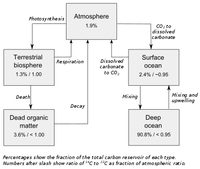 Carbon dioxide produced in this way diffuses in the atmosphere, is dissolved in the ocean, and is taken up by plants via photosynthesis. Animals eat the plants, and ultimately the radiocarbon is distributed throughout the biosphere. The ratio of 14