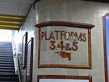 Cardiff Central has eight platforms, numbered 0, 1, 2, 3a/b, 4a/b, 6, 7 and 8. There is no longer, despite signage, a Platform 5; this was a west-facing bay platform situated between Platforms 3 and 4 which was removed in the 1960s.[33][34] Platform 0, a short through platform at the north of the station was created in 1999.[10][27]