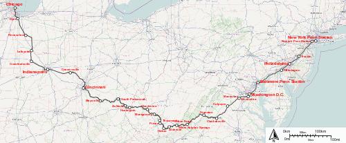 The Cardinal is a thrice-weekly long distance passenger train operated by Amtrak between New York Penn Station and Chicago Union Station, with major intermediate stops at Philadelphia, Washington, D.C., Charlottesville, Charleston, Huntington, Cincinnati, and Indianapolis. It is one of three trains linking the Northeast to Chicago, the others being the Capitol Limited and Lake Shore Limited.