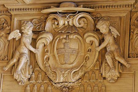 Carved coat of arms of Mazarin on a bookcase in the Bibliothèque Mazarine in Paris