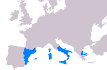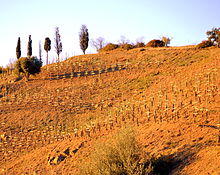 Carignan was likely introduced to Sardinia sometime between 1323-1720 when the island was under the Spanish influence of the Crown of Aragon. Here the grape developed in isolation to form distinct clones under the synonyms Bovale di Spagna and Bovale Grande.[4] At some point the grape reached Algeria where it became a high yielding "workhorse" variety that was widely exported to France to add color and weight to French wine blends. After the phylloxera epidemic devastated French vineyards in the mid to late 19th century, plantings of Carignan grew in popularity on the French mainland. Plantings increased even more when Algeria gained independence in 1962. The grape's prominence in France hit a high point in 1988 when it accounted for 167,000 hectares (410,000 acres) and was France's most widely planted grape variety. However, as France's wine lake problem became more of a concern, authorities within the French government and European Union started an aggressive vine pull scheme where vineyard owners were offered cash subsidies in exchange for pulling up their vines.[3]