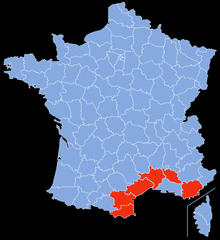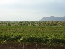 Carignan is most widely found in southern France, particularly in the Languedoc wine regions of Aude, Gard, and Hérault where it is often made as Vin ordinaire and in some Vin de pays wines.[3] In the late 1990s, there were over 60,000 hectares (150,000 acres) of the grape planted in the Aude and Hérault departments alone but by 2009 the total plantings of Carignan throughout France had dropped to 53,155 hectares (131,350 acres). While plantings of the grape in France were more than 9 times higher than the next major Carignan producing country (Spain), this drop in plantings is indicative of the global trend of decline in "workhorse varieties" like Carignan in favor of what the European Union designates as "improving varieties" such as Grenache, Mourvedre, and Syrah.[4]