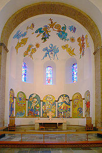 Else Alfelt died in 1974. He moved to Burgundy in the 1980s, but most of his work still came from Danish sources. He surprised many when he worked on the redecoration of the Gothic cathedral in Ribe, working on the murals, painted glass and mosaics to illustrate Bible stories from 1983 to 1987. He also produced bronze sculptures, and works in oils and watercolour.