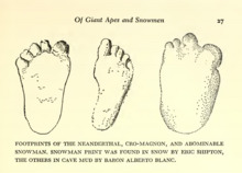 Coon was, up to his death, a proponent of the existence of bipedal cryptids, including Sasquatch and Yeti. His 1954 book The Story of Man included a chapter on "Giant Apes and Snowmen" and a figure showing the purported footprints of an "Abominable Snowman" alongside those of extinct hominids,[50] and in 1984 he wrote a paper on "Why There Has to Be a Sasquatch".[51][52] In the late 1950s, he was approached by Life magazine about either joining Tom Slick and Peter Byrne's expedition to the Himalayas to search for evidence of Yeti, or organising his own expedition.[53] Although Coon spent some time planning the logistics, in the end neither materialised.[53] Coon believed that cryptid "Wild Men" were relict populations of Pleistocene apes and that, if their existence could be proved scientifically, they would lend support to his theory of the separate origins of human races.[53]