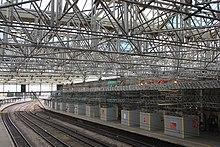 Additional tracks, buildings and platforms were constructed including an island platform with two-storey buildings which increased the 400 metre-long through platforms to three.[3] Five terminal bay platforms were constructed and an overarching footbridge which connected the through platforms inside the train shed. Below the platforms, the undercroft contains a network of passageways, offices, service rooms and staff accommodation; parts of the underground areas are reputed to be haunted.[3]