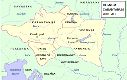 In 856, Louis first associated Carloman with his rule by appointing him governor of Carantania. According to the Annales Fuldenses (863), he was given the title "prelate of the Carantanians" (Latin: praelatus Carantanis).[10][4] Since this was his first governorship, Louis did not give him rule over the entire March of Pannonia, with traditional seat of frontier governor (prefect) at Tulln. Instead, Carloman was given rule over the inner region (Carantania), in order do gain experience, and perhaps because his father wanted to keep him from trying to seize to much power.[6]