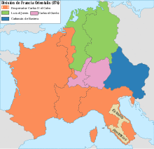 Carloman was old enough to participate in the civil war of 840–43, waged between his father and his uncles, Lothair and Charles the Bald.[4] His first record public appearance is as the leader of an army of reinforcements from Bavaria and Alemannia which he brought to his father at Worms in 842. He subsequently led them in battle alongside his father and uncle (Charles the Bald) against his other uncle (Lothair).[5] It was the beginning of a warlike career. Notker of Saint Gall, who bewailed the decline of the dynasty a generation later, called Carloman bellicosissimus (literally "most warlike", or in historian Eric Goldberg's words a "real ass-kicker").[6]