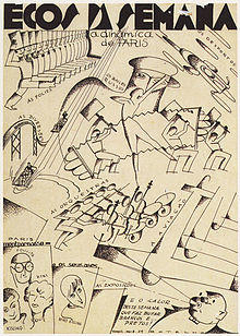 In 1928, he started a comic page in the weekly publication Sempre Fixe, a collaboration that he maintained for over 22 years and which was the stage for a caustic criticism of a vast range of issues, going from trivial matters of daily life in Lisbon to some of the most relevant events in international life, in a "style that mixed up chronicle, autobiography, journalism, and satire",[4] making it an early example of autobiographical comics. On 8 December 1950, the date when he ended that monumental cycle of work, his Ecos da Semana (Echoes of the Week) made a total of about 1,200 pages, "in a continuous discourse with no intervals or holidays".[5]