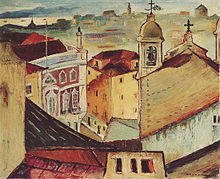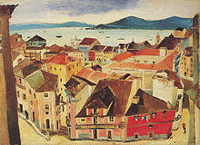 Firstly, the urban landscape of the city in which he was born and lived. Lisbon soon stands out as the "predominant iconography, even the body of the deepening of the painter’s recourses and of their successive poetics". It is not, however, the almost single path we find in his later work: "landscape is enunciated […] as a possibility in this recently-started career, but it is not yet the imperative matrix of the future". Botelho will also paint other cities: Paris, Florence, Amsterdam, New Orleans and, above all, New York: "In terms of Portuguese art at the end of the […] nineteen thirties, these paintings are located at the vanguard of everything that was being done at the time".[10]