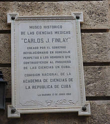 On the wall of the Finlay Medical History Museum in Havana, the inscription states, "History Museum of the Medical Sciences ' Carlos J. Finlay', created by the Revolutionary Government in eternal homage to the men who contributed to the advance of the sciences in Cuba. National Commission of the Academy of Sciences of the Republic of Cuba. Havana, 13 June 1962."