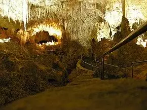 The park contains over 119 caves.[26] Three caves are open to public tours. Carlsbad Caverns is the most famous and is fully developed with electric lights, paved trails, and elevators. Slaughter Canyon Cave[27] and Spider Cave[28] are undeveloped, except for designated paths for the guided "adventure" caving tours.