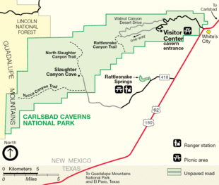 The park entrance is located on US Highway 62/180, approximately 18 miles (29 km) southwest of Carlsbad, New Mexico. Carlsbad Caverns National Park participates in the Junior Ranger Program.[3] The park has two entries on the National Register of Historic Places: The Caverns Historic District and the Rattlesnake Springs Historic District.[4] Approximately two thirds of the park has been set aside as a wilderness area, helping to ensure no future changes will be made to the habitat.