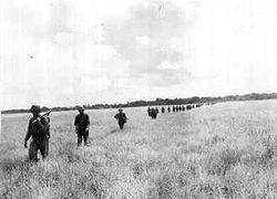 At first light on 6 November, Carlson and his command group, two of his companies, and a group of native scouts and carriers commanded by Major John Mather of the Australian Army and Sergeant Major Jacob C. Vouza of the Solomon Islands Police Force set out from Aola on the patrol. The group marched along a jungle trail northwest to the Reko River, arriving on 7 November. At the Reko, Carlson learned that the local Christian mission had recently been raided by Japanese troops who had killed two of the missionaries before moving west. Pushing across the river with one platoon of troops, Carlson encountered a small group of Japanese who shot and severely wounded the native scout leading the Marine column. Returning fire, the Marines killed two Japanese soldiers and drove off another three or four. Carlson's main body then arrived and the column bivouacked for the night.[18]