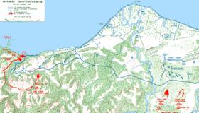 On 8 November, the column continued through the jungle to the northwest, striking the coast at the Kena River, and made camp at the village of Tasimboko, 15 mi (24 km) from Aola Bay. The next day they crossed the Berande and Balasuna rivers and reached the village of Binu—10 mi (16 km) southwest of Tasimboko—in the afternoon. At Binu, about 3 mi (4.8 km) southeast of Koli Point, Carlson established his base camp and prepared to block the movement of any Japanese forces from Koli to the east and south.[19]