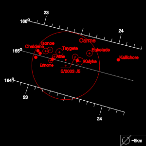 - ^ Scott S. Sheppard, David C. Jewitt, Carolyn Porco Jupiter's outer satellites and Trojans, In: Jupiter. The planet, satellites and magnetosphere. Edited by Fran Bagenal, Timothy E. Dowling, William B. McKinnon. Cambridge planetary science, Vol. 1, Cambridge, UK: Cambridge University Press, ISBN 0-521-81808-7, 2004, p. 263 - 280 Full text(pdf). Archived June 14, 2007, at the Wayback Machine