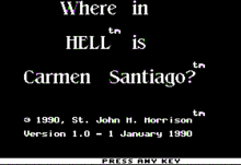 Where in Hell Is Carmen Santiago? is a 1990 game developed by St. John M. Morrison, which has players hunt down Carmen in the afterlife. Broderbund does not recognize this as a part of the series.[11][12] It has the status of "a Copyrighted FreeWare".[13] The title screen started with the word "Heck", which was rubbed off and replaced with "HELL".[11] The creator of the game had never played a Carmen Sandiego game, but was very familiar of the franchise due to its constant appearance in gaming magazines. He crafted a first person adventure game based on this premise and copied the naming scheme of the titles.[14][13]