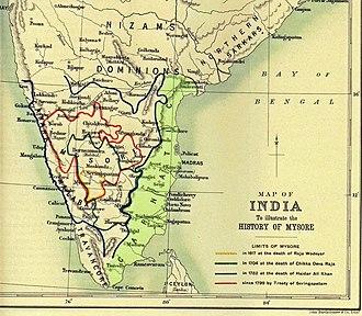 Towards the close of the 17th century, the northernmost part of The Carnatic region was reduced by the armies of Aurangzeb, who in 1692 appointed Zulfikar Ali, Nawab of the Carnatic, with his seat at Arcot. Meanwhile, the Marathas power had begun to develop; in 1677 Shivaji had suppressed the last remnants of the Vijayanagar power in Vellore, Gingee and Kurnool, while his brother Venkoji, who in 1674 had overthrown the Nayaks of Tanjavur, established in that city a dynasty which lasted for a century. The collapse of the Delhi power after the death of Aurangzeb produced further changes. The Nawab Saadet-Allah of Arcot (1710–1732) established his independence; his successor Dost Ali (1732–1740) conquered and annexed Madura in 1736, and his successors were confirmed in their position as Nawabs of Northern Carnatic by the Nizam of Hyderabad after that potentate had established his power in South-Central India. After the death of Nawab Mahommed Anwar-ud-din (1744–1749), the succession was disputed between Mahommed Ali and Husein Dost. In this quarrel, the French and English, then competing for influence in the Carnatic, took opposite sides. The victory of the British established Mahommed Ali in power over northern Carnatic till his death in 1795. Meanwhile, however, the region had been exposed to other troubles. In 1741 Madura, which the Nawab Dost Ali (1732–1740) had added to his dominions in 1736 after the demise of the Nayaks of Madurai, was conquered by the Marathas; and in 1743 Hyder Ali of Mysore overran and ravaged the central Carnatic. The latter was re-conquered by the British, to whom Madura had fallen in 1758; and, finally, in 1801 all the possessions of the Nawab of Arcot were transferred to them by a treaty which stipulated that an annual revenue of several lakhs of pagodas should be reserved to the Nawab, and that the British should undertake to support a sufficient civil and military force for the protection of the country and the collection of the revenue. On the death of the Nawab in 1853, it was determined to put an end to the nominal sovereignty, a liberal establishment being provided for the family.[1]