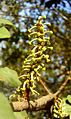 Most carob trees are dioecious and some are hermaphroditic, so strictly male trees do not produce fruit.[12] When the trees blossom in autumn, the flowers are small and numerous, spirally arranged along the inflorescence axis in catkin-like racemes borne on spurs from old wood and even on the trunk (cauliflory); they are pollinated by both wind and insects. The male flowers smell like human semen, an odor that is caused in part by amines.[13]