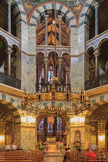 Louis the Pious used the palace system much to the same effect as Charlemagne during his reign as king of Aquitaine, rotating his court between four winter palaces throughout the region.[38] During his reign as Emperor he used Aachen, Ingelheim, Frankfurt, and Mainz which were almost always the locations for general assemblies held 'two or three [times] a year in the period 896–28...' and while he was not an immobile ruler, his reign has certainly been described as more static.[38] In this way the palace system can also been seen as a tool of continuity in governance. After the splintering of the Empire the palace system continued to be used by succeeding Carolingian rulers with Charles the Bald centring his power at Compiègne[39] where the palace chapel was dedicated to the Virgin Mary in 877, something remarked on as a sign of continuity with Aachen's Mother of God chapel.[40] For Louis the German, Frankfurt has been deemed his own 'neo-Aachen' and Charles the Fat's palace at Sélestat in Alsace was designed specifically to imitate Aachen.[40]