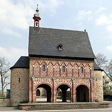 The gatehouse of the monastery at Lorsch, built around 800, exemplifies classical inspiration for Carolingian architecture, built as a triple-arched hall dominating the gateway, with the arched facade interspersed with attached classical columns and pilasters above.