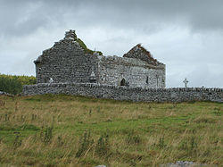 - Carran church (Teampull a'Chairn), located on the road between Leamaneh Castle and Ballyvaughan, is a ruin that measures 19 metres in length and 7 metres in breadth. The west end contains a (broken) belfry at the top and the south end has a pointed doorway and two windows, one of which is pointed and the other which is broken. These features indicate a construction date in the 15th century. The east end contains another pointed window broad on the inside and narrow on the outside. There seem to have been living quarters for the priest above the ground floor worship area. A broken stone altar remains under this window and at the left corner is a holy water font. In the north wall were three corbels decorated with carved heads, two males and one female. Only one of these heads now remains, two were removed in the 1970s. The remaining head wears a kind of hood or helmet or basinet indicating a carving from the late 14th or early 15th century.[9]:35–36[10]:122–7